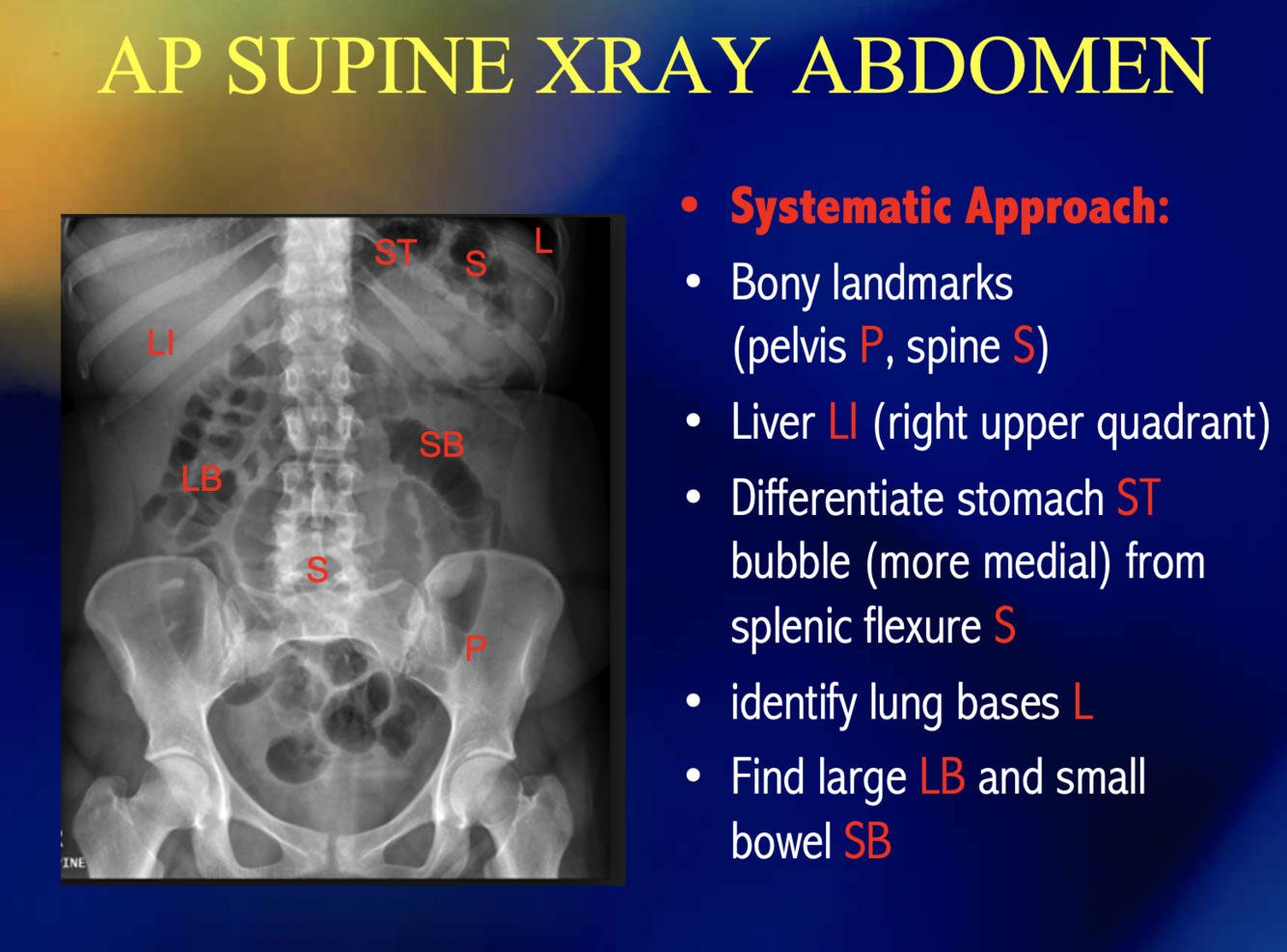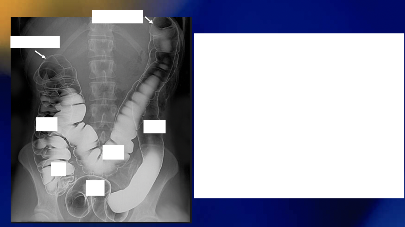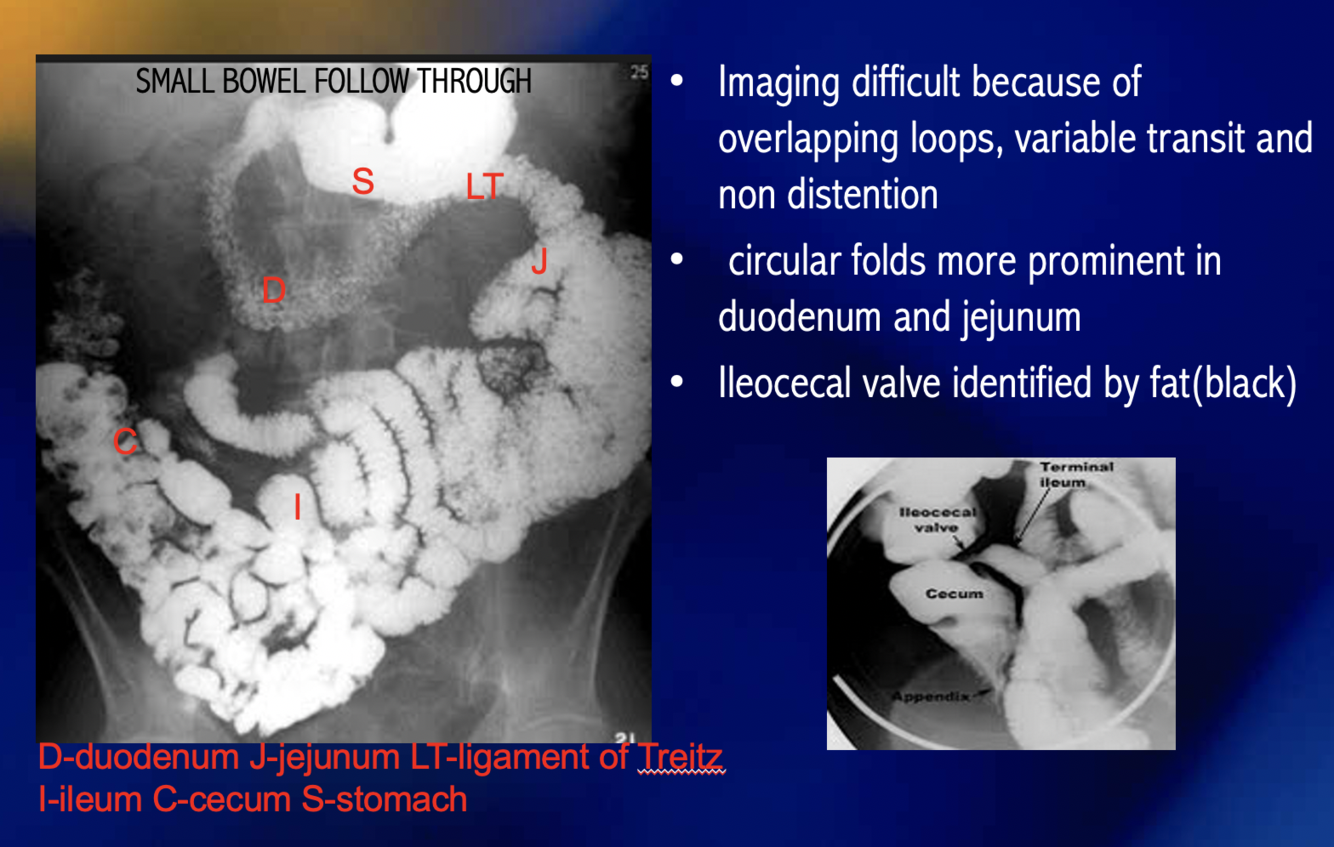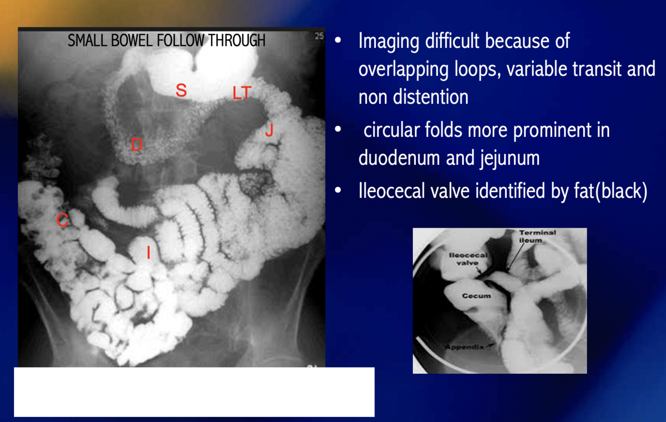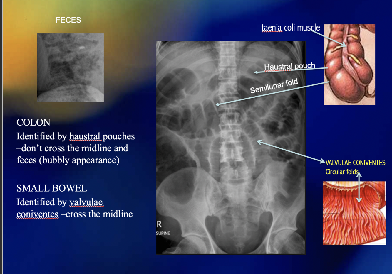 How can you differentiate between the small and large intestines in xray?