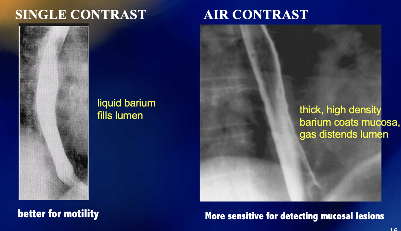 Single contrast barium is used to examine [….] while air contrast barium is used to examine […]