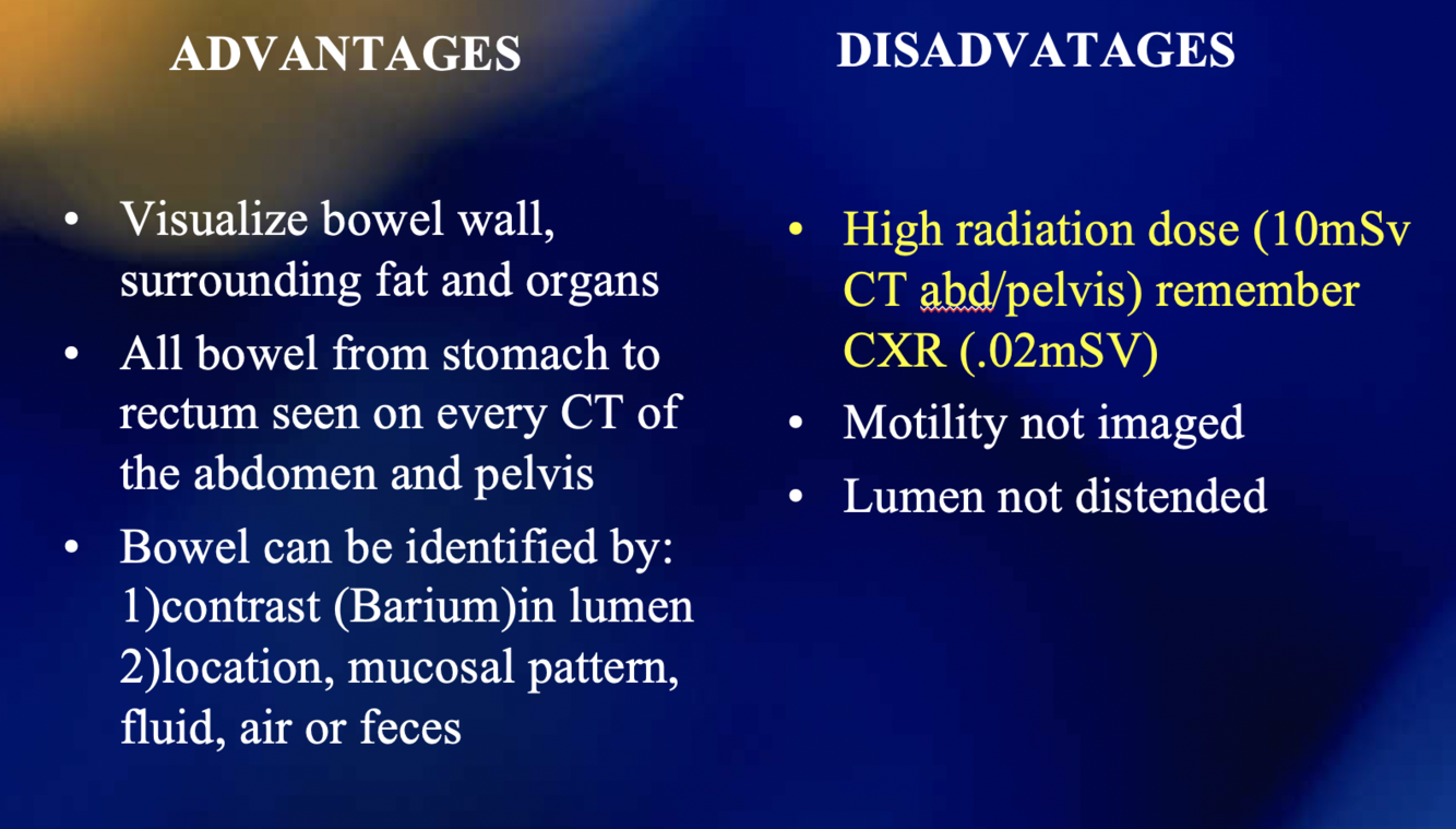 What are the advantages and disadvantages of an abdominal CT?