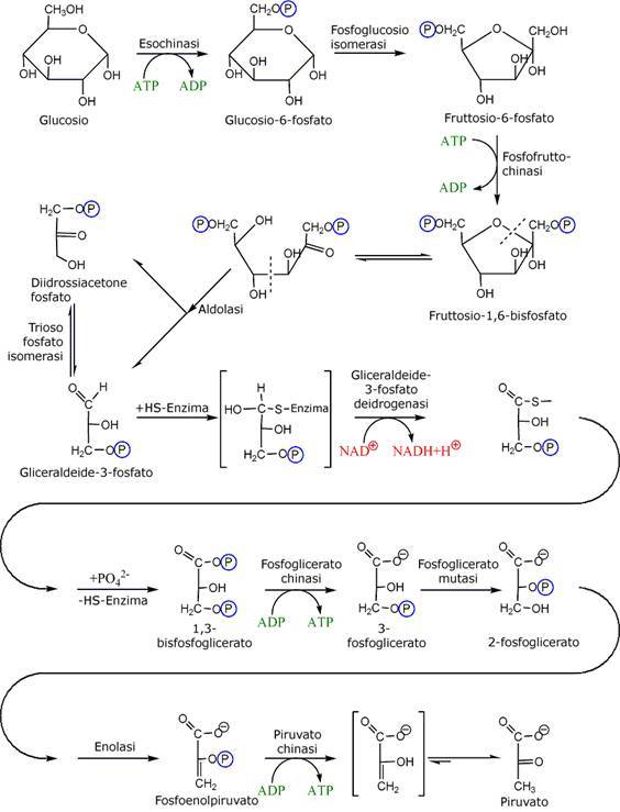 Glucosio + 2 NAD+ + 2 ADP + 2 Pi → 2 NADH + 2 piruvato + 2 ATP + 2 H2O + 2 H+