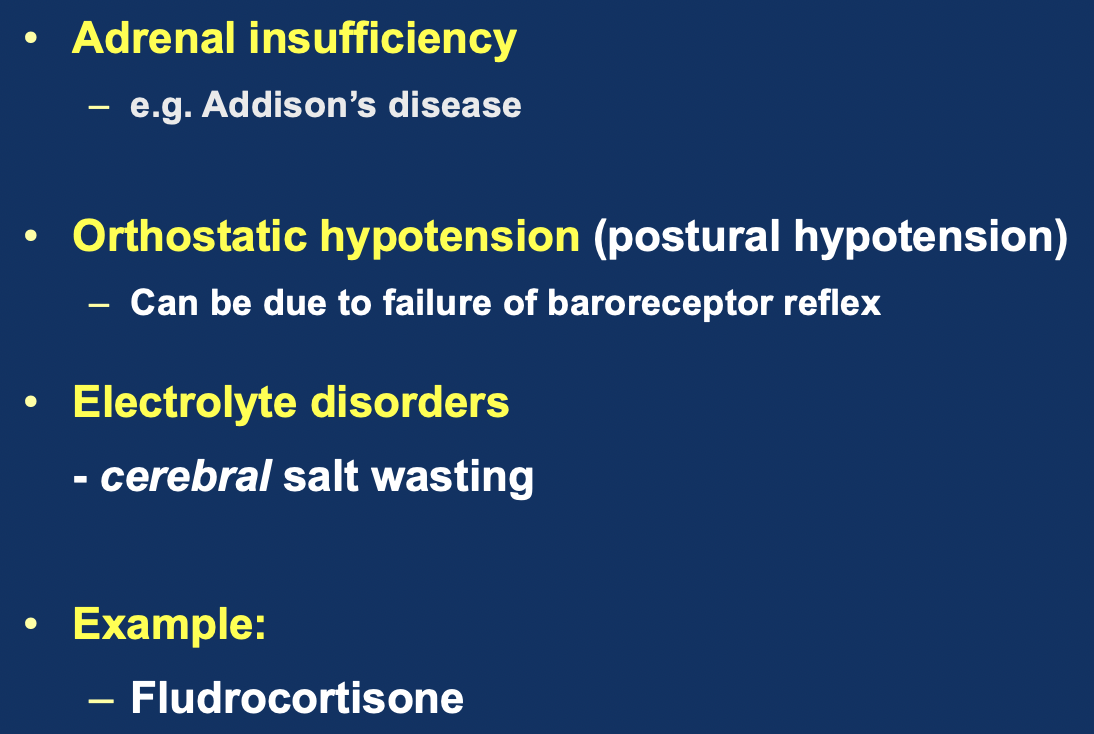 Adrenal insufficiency or failure (Addison’s): congenital or drug-induced. Treatment=combined GC and MC