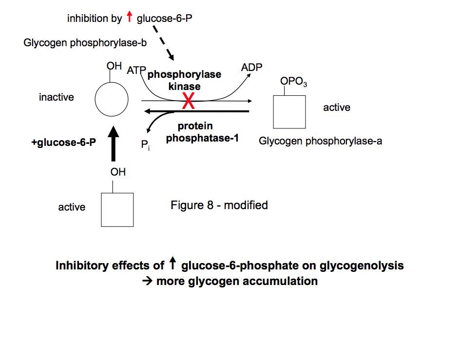 The limitation of glycolysis causes an increase in the concentration of glucose6P, which counteracts to some extent for the activation of glycogenolysis by glucagon following food deprivation.
