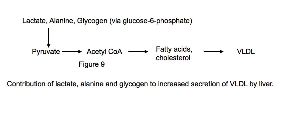 -Acetyl CoA is a precursor to synthesis of fatty acids and cholesterol that contribute to the formation and secretion of VLDL; hence the development of hypertriglyceridemia and hypercholesterolemia