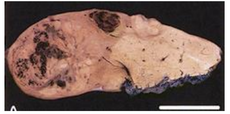 Liver resection in glycogen storage disease type Ia. Multiple tumor nodules with smooth borders; uninvolved parenchyma pale ; bar = 5cm