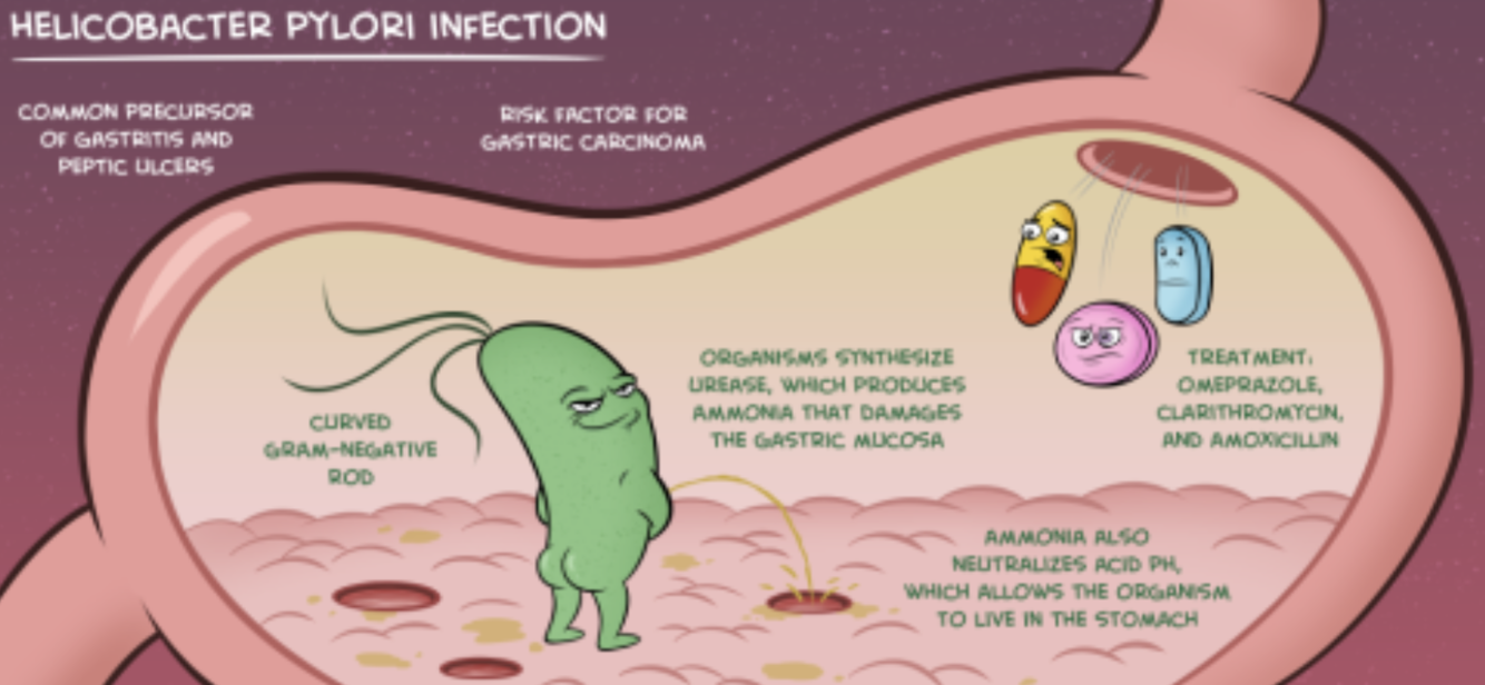 Helicobacter pylori - natural habitat is human stomach - damages mucosa and causes ulcers