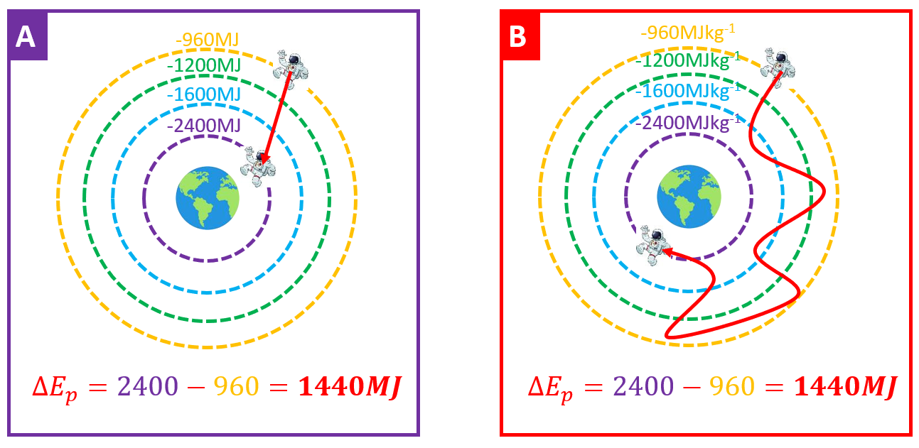 Neither. Potential energy (and potential) are scalar quantities so are unaffected by the path