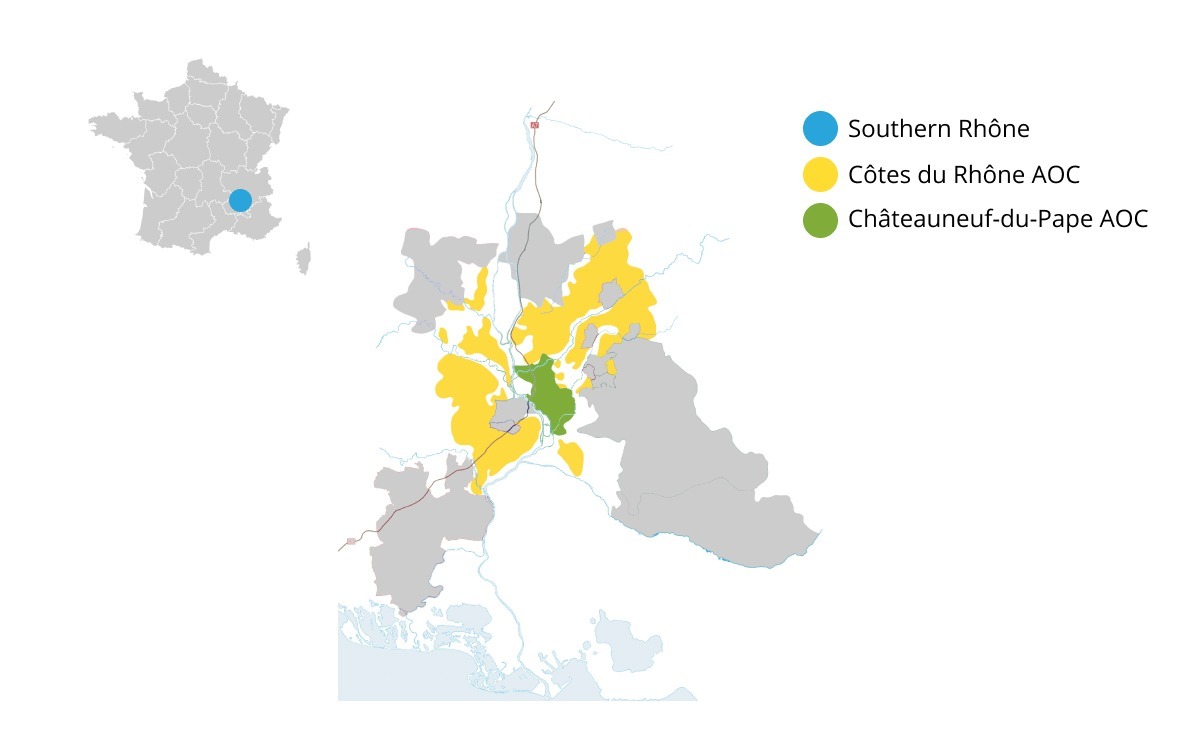 Grenache is one of many black grapes in the Southern Rhône. It is typically blended with Syrah and other local grapes (e.g. Mourvèdre).