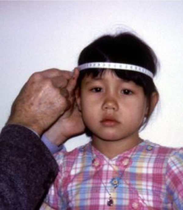 Place the measuring board on a firm, flat surface. Lay the child/young person on the board. One person should ensure the head is held in contact with the headboard. They should then place the child/young person’s head with the lower margins of the orbit in the same horizontal plane as the external auditory meati, ie the corner of the eyes horizontal to the middle of the ear. The other person should position the child/young person with their feet together heels touching the back plate of the measuring instrument legs straight and in alignment with the body buttocks against the backboard scapula, wherever possible, against the backboard