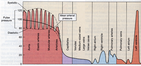 elasticity changes in the blood vessels as you move further and further away from the heart, the pressure in which the vessels can handle drops.