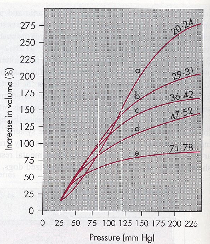 what happens to old people / smokers regarding compliance? why effect does this have on BP?