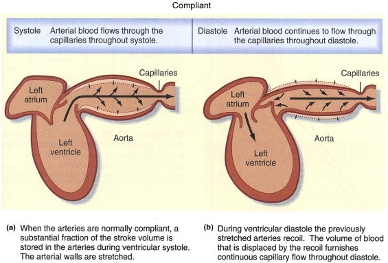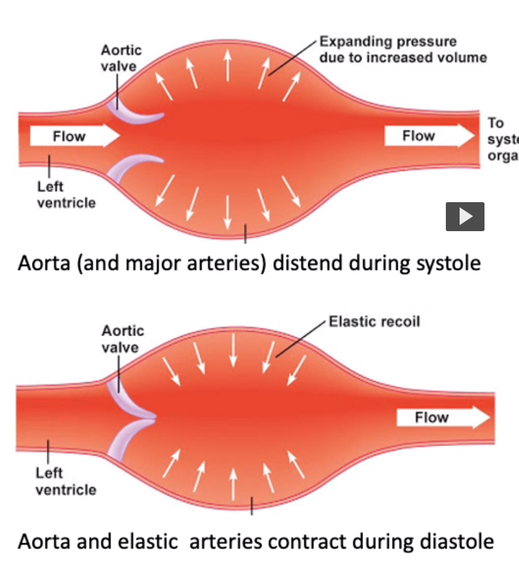 The walls of the aorta and elastic arteries distend when the blood pressure rises during systole and recoil when the blood pressure falls during diastole. There is a thus net storage of blood during systole which discharges during diastole.