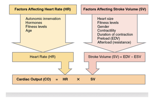 Note that most of the increase in C.O. in exercise is due to an increase in heart rate (from 72 to 190 i.e. 2.6 times) rather than stroke volume (from 70 to 100 i.e. 1.4 times)