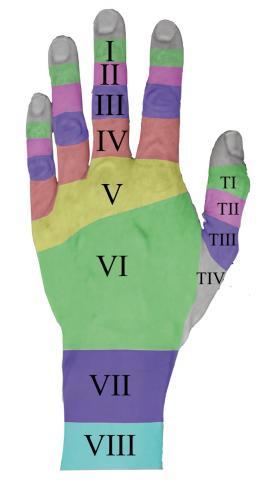 Opponens pollicis, 3rd and 4th lumbricals, hypothenar group (opponens digiti minimi, flexor digiti minimi, abductor digiti minimi), palmaris brevis