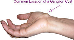 Synovial cyst caused by leakage of synovial fluid from joint into surrounding tissue. Most commonly on radial wrist. Dx: xray should show no changes since it is soft tissue deal. Tx: reassurance, aspiration if severe pain, surgery if median nerve compression or really ugly.