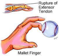 Rupture of extensor tendon at insertion into distal phalanx -> inability to extend DIP. Splint for 6-8 weeks, surgery may be needed for those injuries not splinted early.