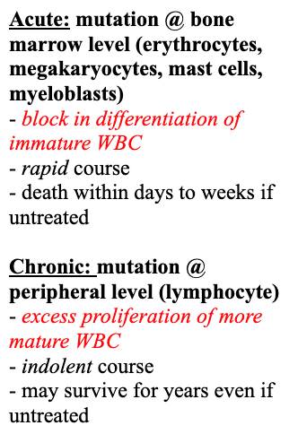 Describe the etiology of acute versus chronic leukemia