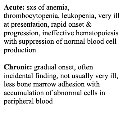 Describe the difference in clinical presentation between acute and chronic leukemia
