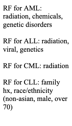 Describe the risk factors for the different forms of leukemia (acute v chronic & myeloid v lymphoid)