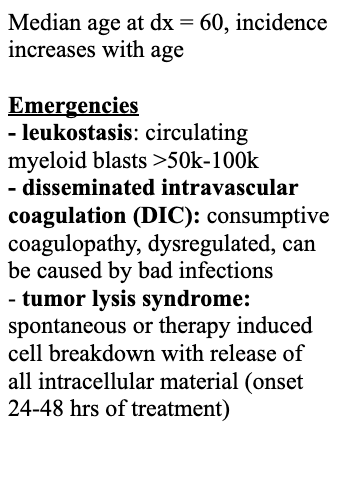 Describe the etiology of acute myeloid leukemia and the common emergencies within