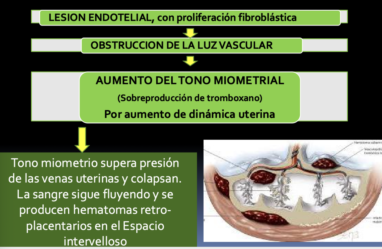 Triplica el riesgo debido a lesión endotelial, proliferación fibroblástica, obstrucción vascular y aumento del tono miometrial por tromboxano.