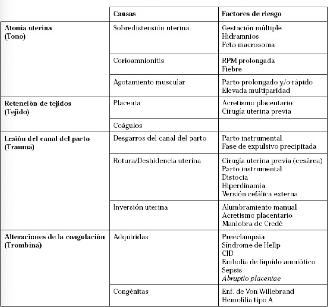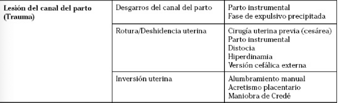 Sangrado anormal y excesivo del sitio de inserción placentaria, traumatismos del tracto genital o estructuras adyacentes. 🔴 Incluye cualquier pérdida que cause compromiso hemodinámico.