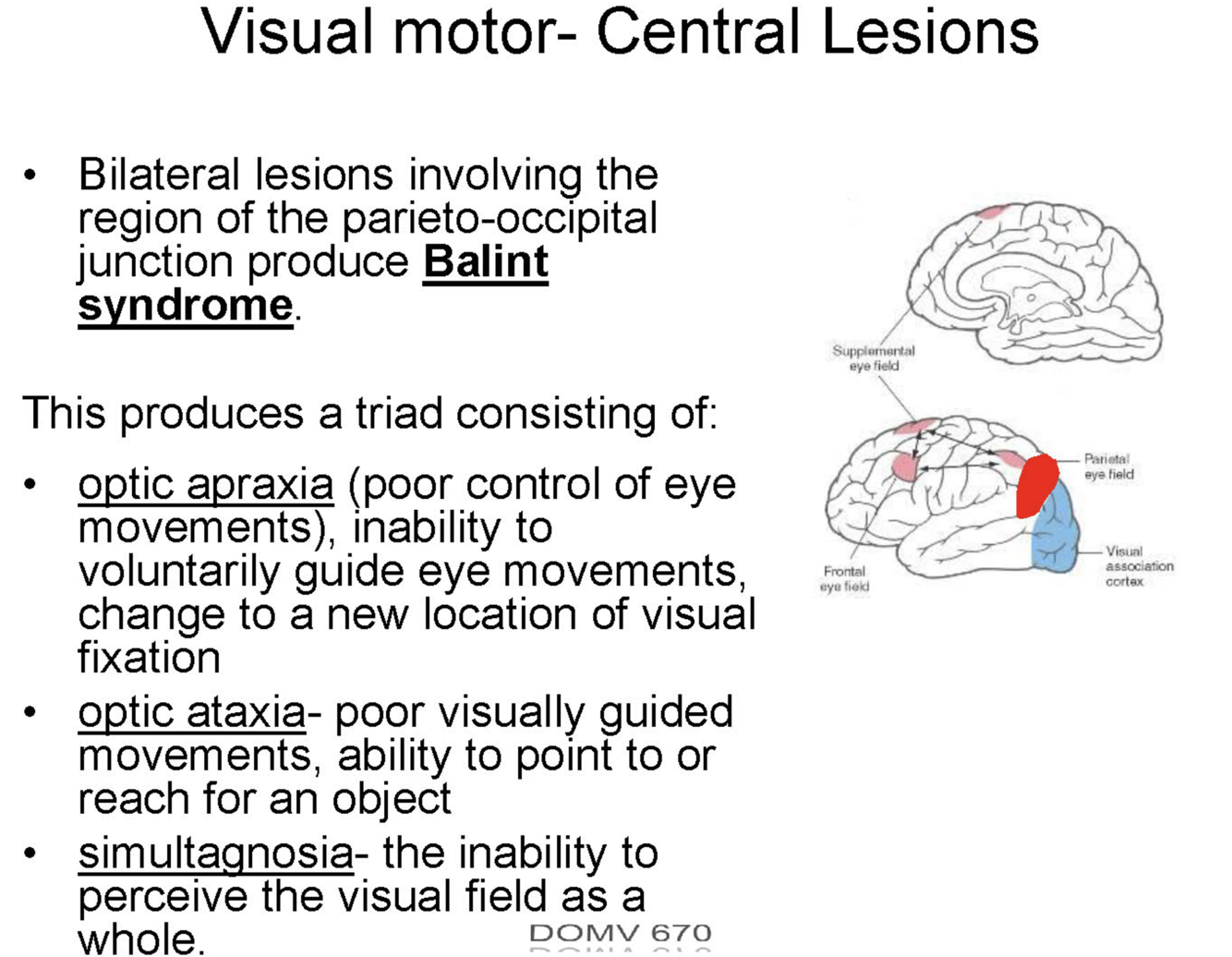 Balint syndrome: bilateral lesions of the parietal occipital Junction