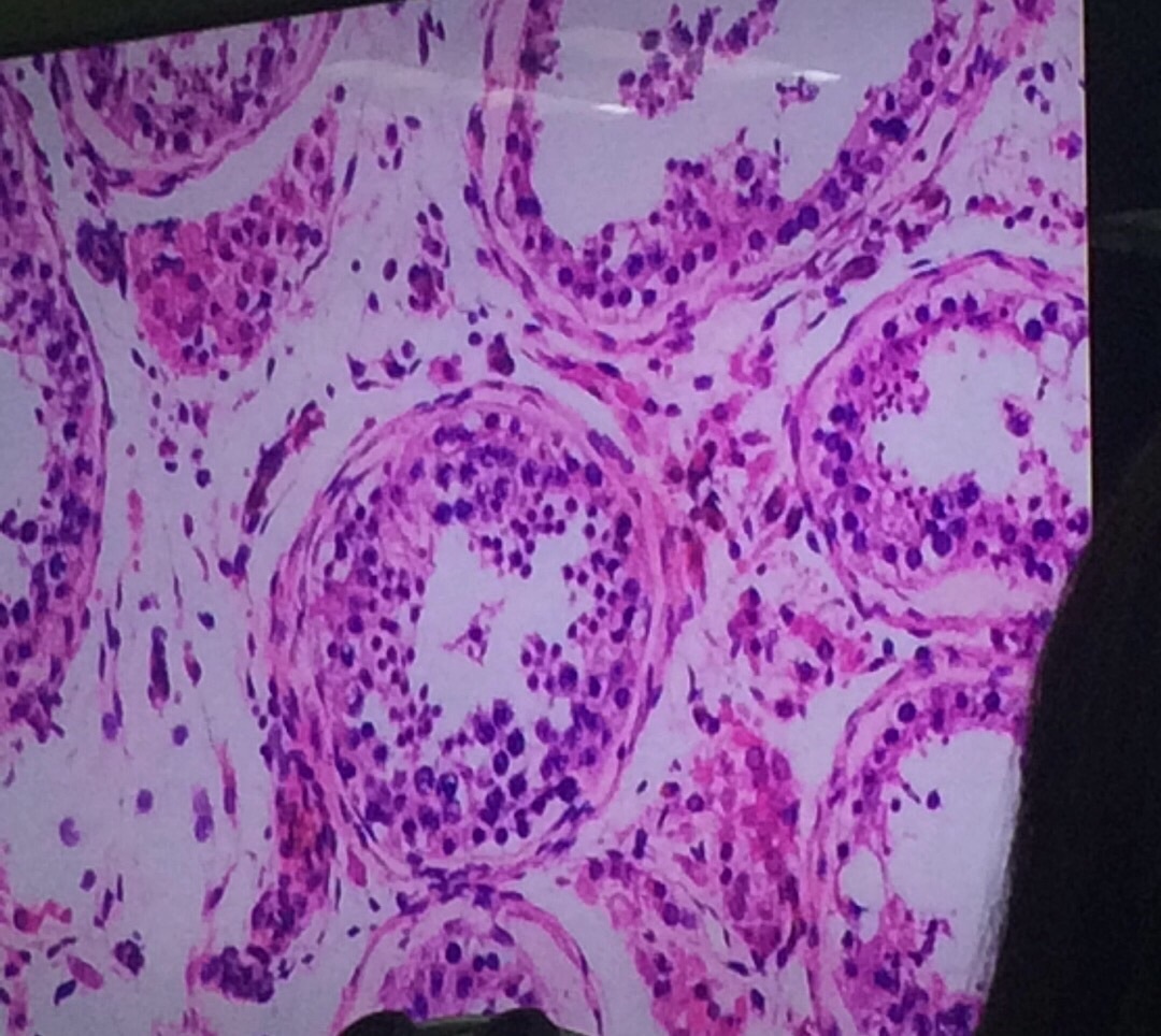 Leydig cells - acidophillic, produce testosterone, in between the tubules in the interstital space