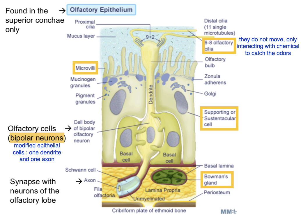 What are the main types of cells in the olfactory cavity?