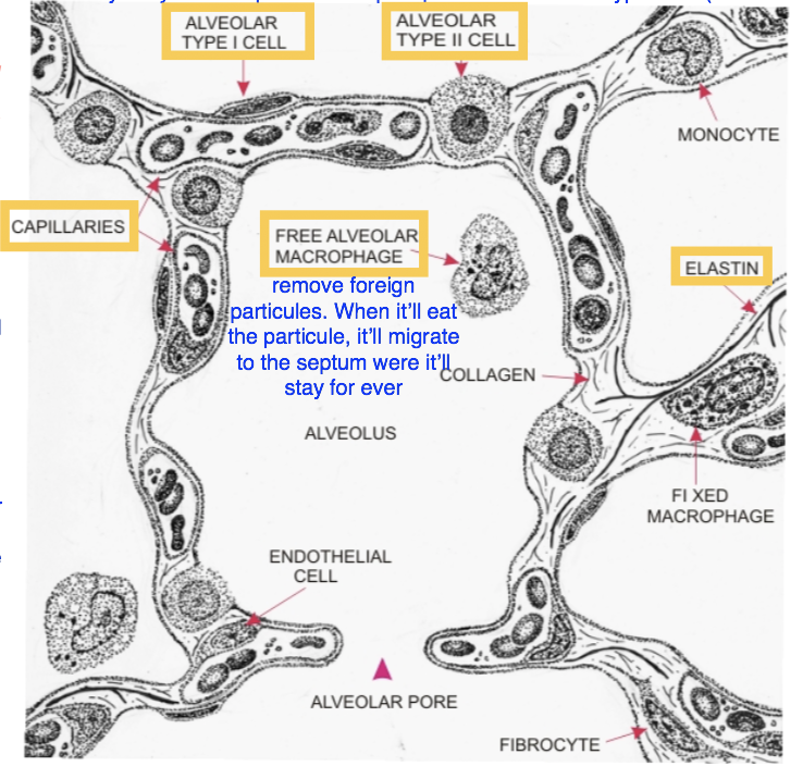 Simple squamous epithelium cells: pneumocyte type 1 facing the lumen and type 2 are bigger