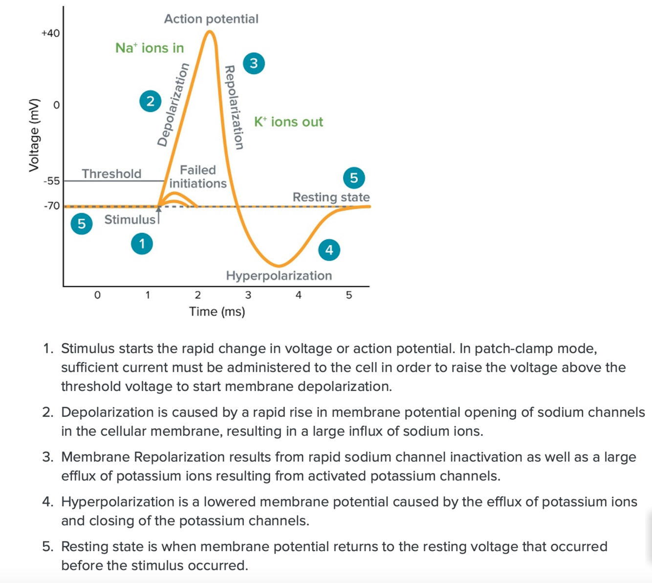 <ol> <li>Leaky K+channels bring the cell to threshold (graded potential)</li> <li>Voltage gated channels open allowing Na+to flow in and bring the cell to +40mV</li> <li>More K+channels open and bring the cell down to -90mV</li></ol>