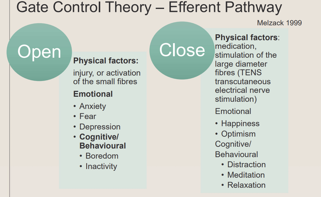 1. not only does the spinal cord modulate pain locally, but the brain can send signals down - EFFERENT PATHWAY - to influence the gate