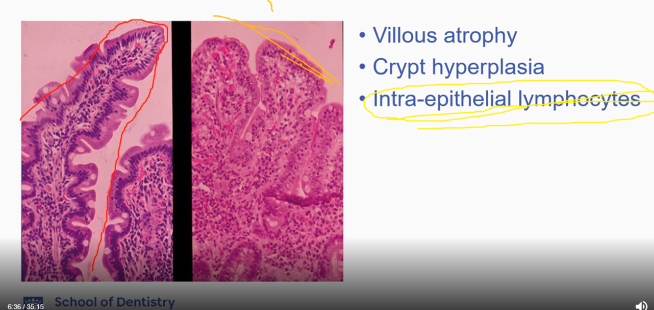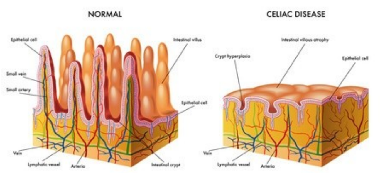 Crypt hyperplasia is when the grooves are elongated compared to a normal intestinal lining which has short crypts. Blunted or atrophic villi. This is a shrinking and flattening of the villi due to repeated gluten exposure.