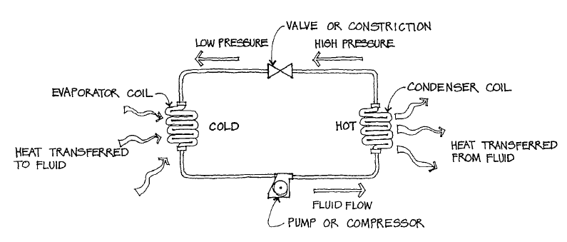 The pump that increases the pressue of fluid, forcing the Freon to condense, thus releasing the latent heat of evaporation.