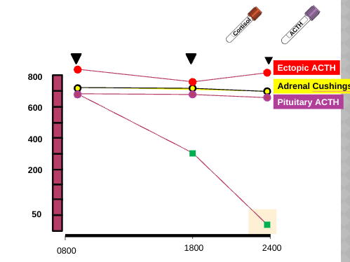 describe ACTH levels in the morning versus the evening in a patient with ectopic ACTH, adrenal cushings and pituitary ACTH?
