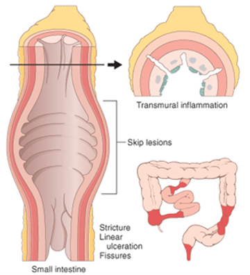 Chronic, recurrent condition that causes patchy transmural inflammation that can involve any part of the gastrointestinal tract (mouth to anus)