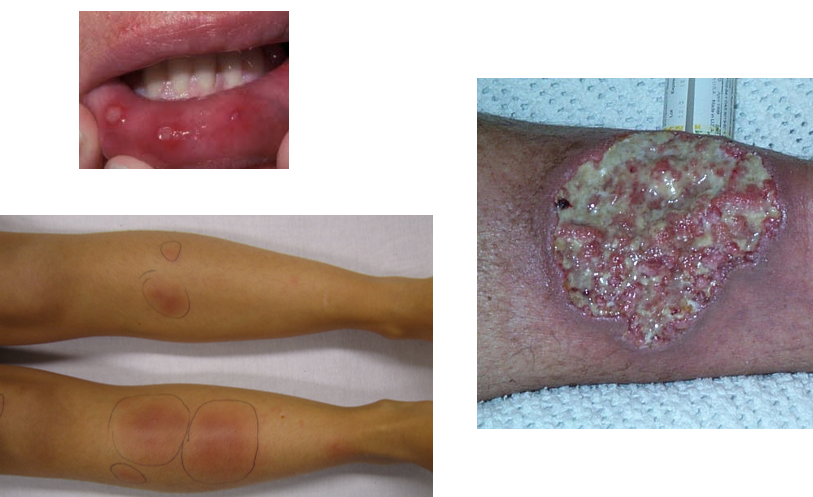 aphthous ulcers, erythema nodusum, pyoderma gangrenosum