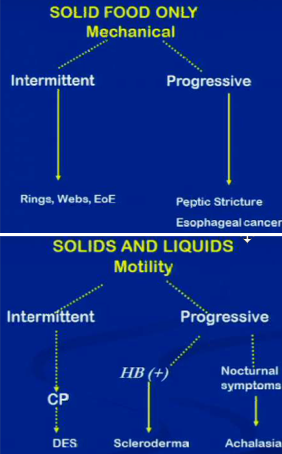 Solids only: rings, webs, EoE, peptic stricture, esophageal cancer. Both: diffuse esophageal spasm, scleroderma, achalasia