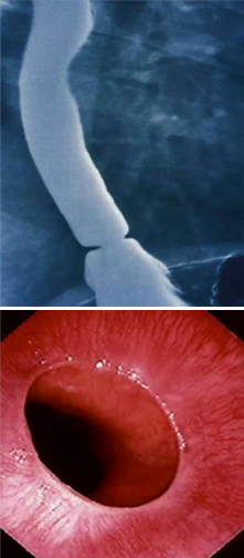 Progressive solid food dysphagia. This is a peptic stricture from long standing GERD that has damaged the mucosal lining of the esophagus.