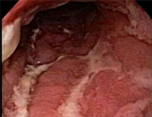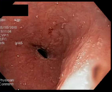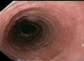 This is eosinophilic esophagitis, note the eosinophilic microabscesses on the esophageal wall and concentric rings. This is diagnosed by biopsy w/15-20 Eos per high power field.