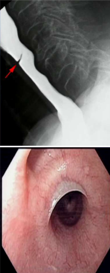 Barium esophagram (diagnostic only, less invasive) or upper endoscopy (diagnostic & therapeutic = 1st choice)