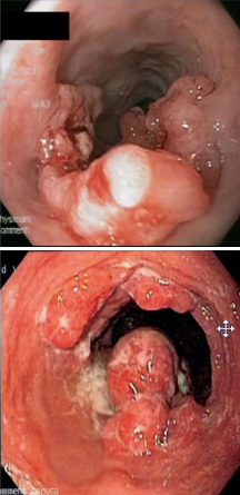 Top: SSC, associated w/African American and tobacco/alcohol use. Typically occurs mid esophagus. Bottom: Adenocarcinoma, associated with Barrett esophagus, GERD, older white men. Typically occurs distal esophagus.