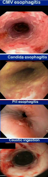 Secondary to mucosal break/ulcer, infection (HSV, CMV, Candida = white plaques), pills (kissing ulcers), caustic agent (diffuse, circumferential injury), radiation