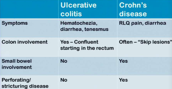How do ulcerative colitis and Crohn’s disease differ in symptoms, colon involvement, small bowel involvement and perforating/stricture disease?