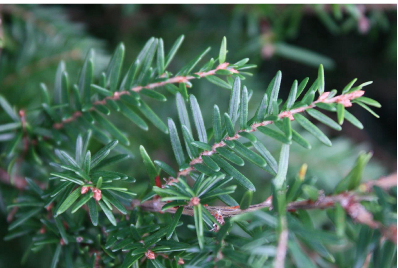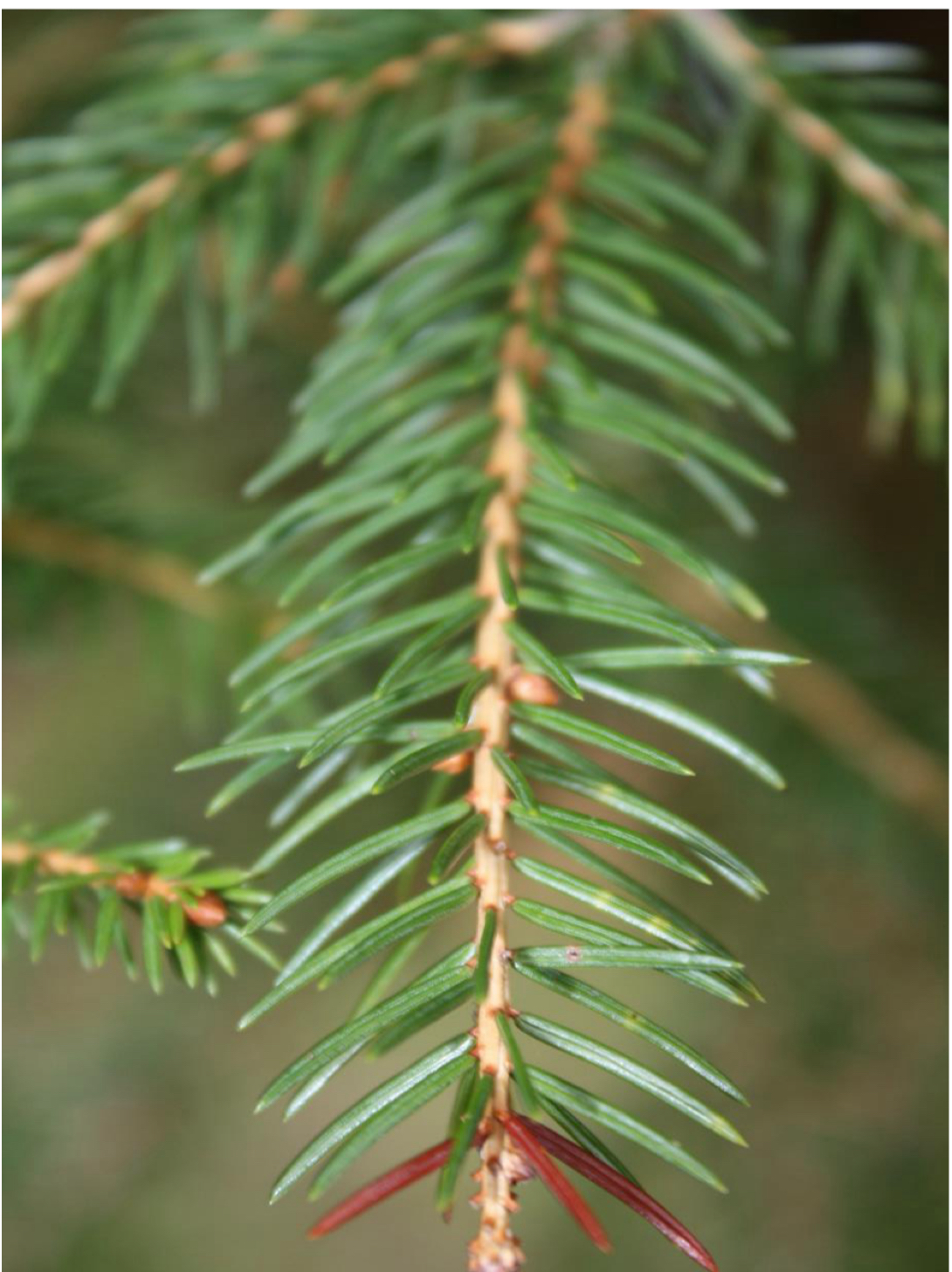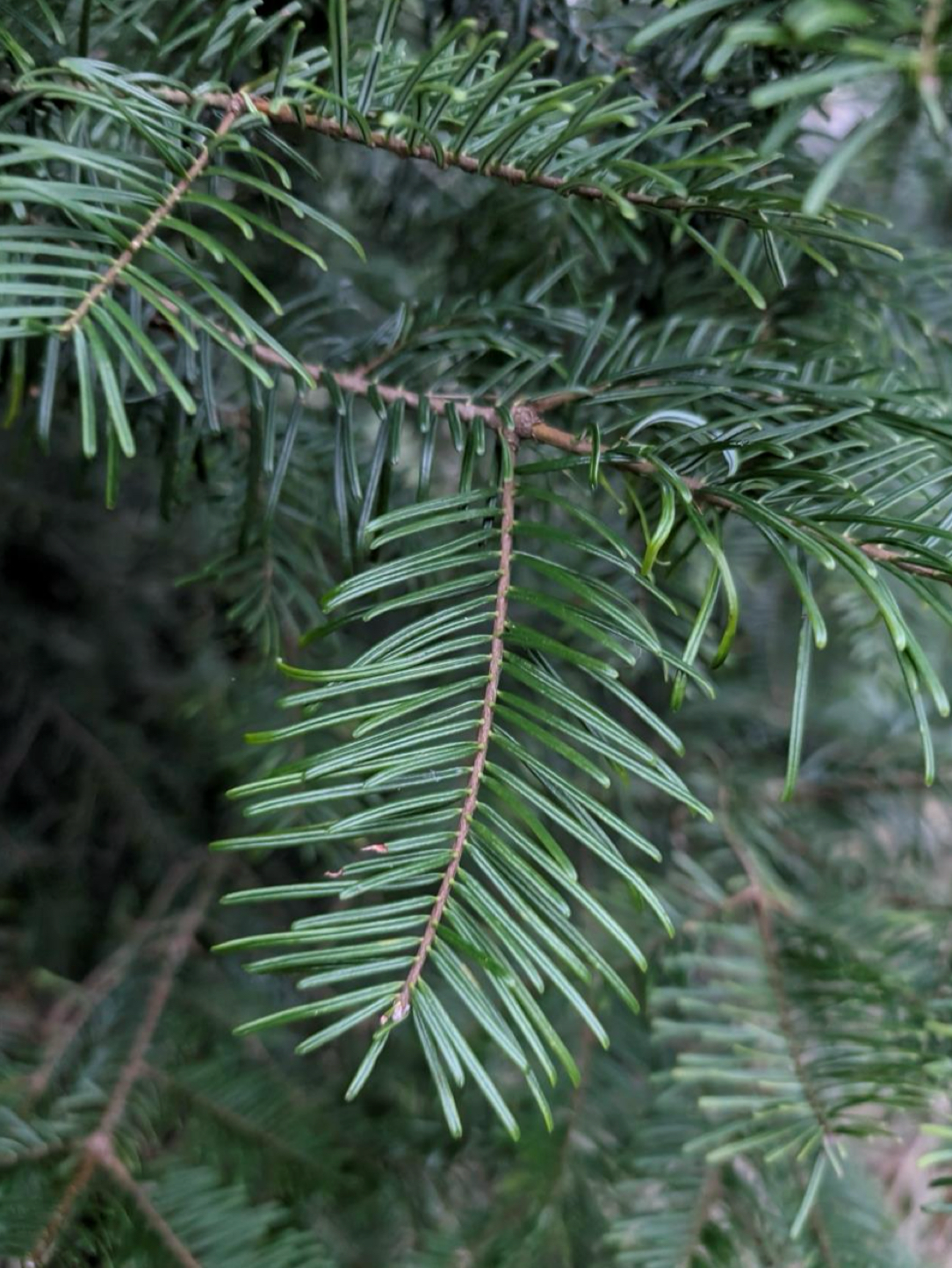 Soft and flat needles with a glossy green top and two white stomatal bands on the underside.