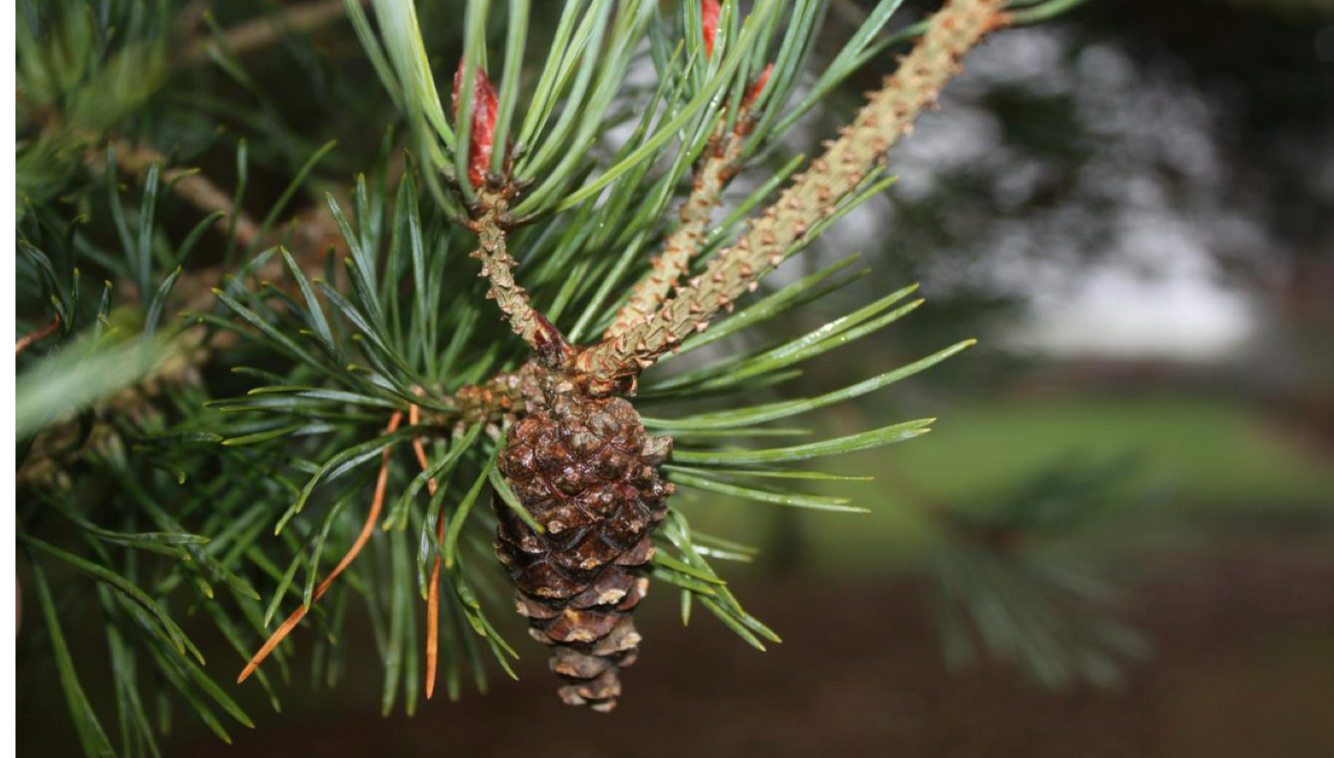 Twisted needles in facicles of 2 with a bluish-green hue; bark at the base is thick and scaly, while upper bark has an orange-red colour.