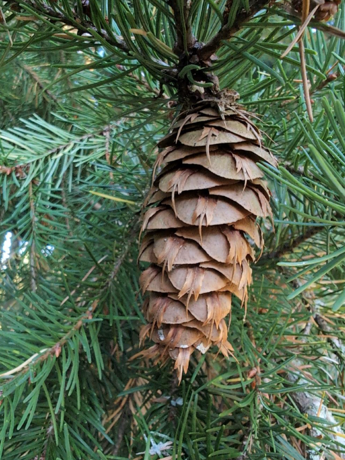 Cones with distinctive trident shaped bracts extending beyond scales.