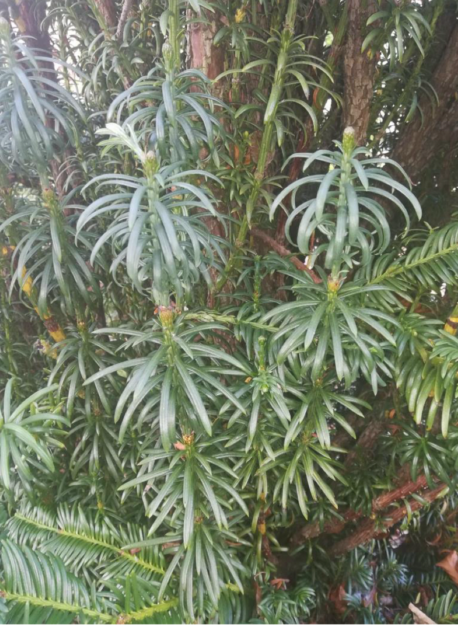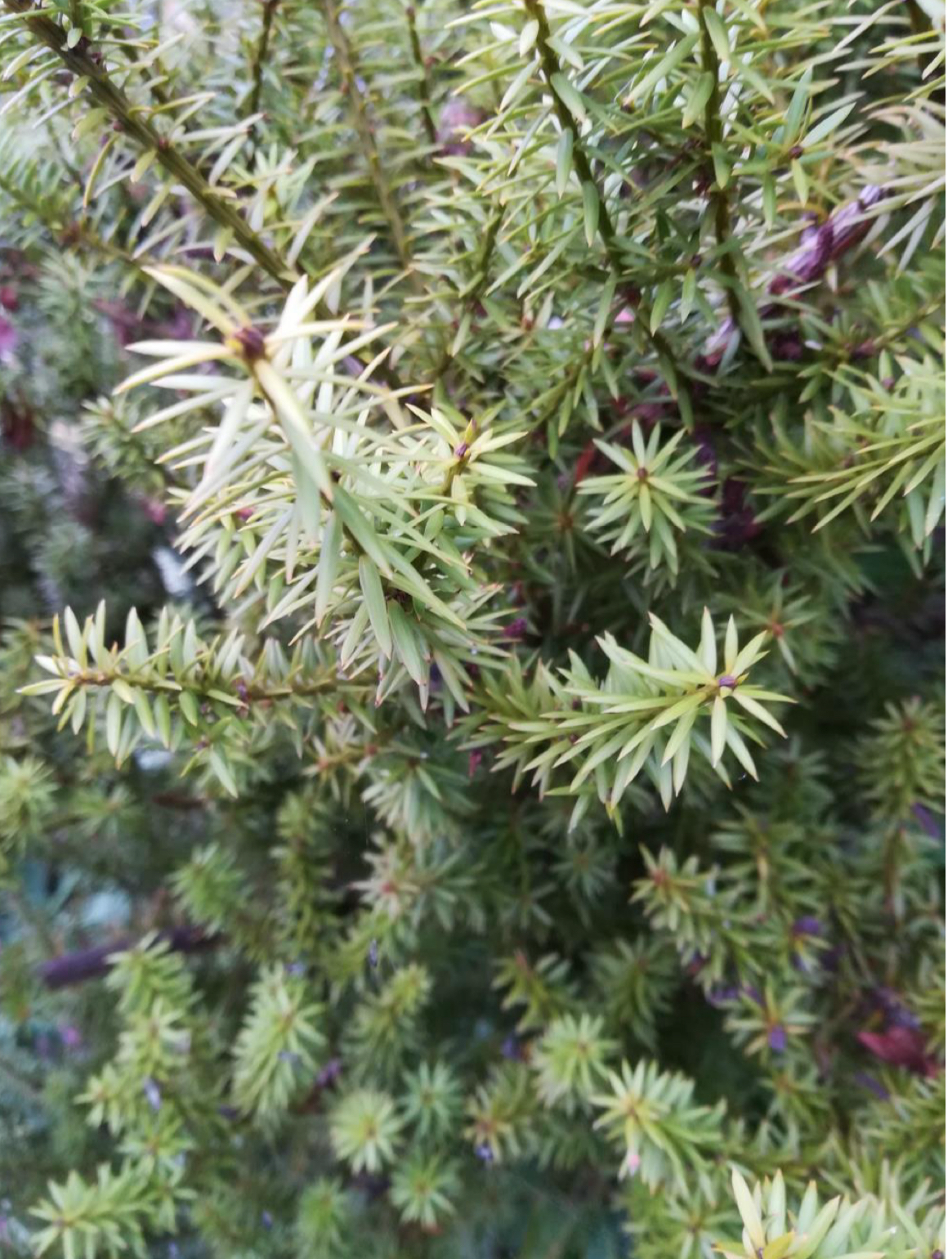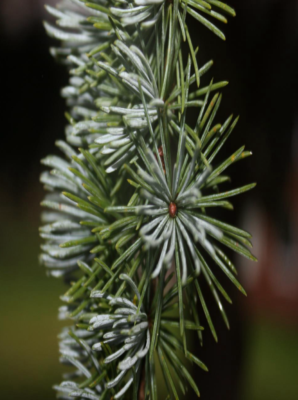 Sharp, needlelike leaves in whorls of 3, with a blue-green colour and a white stripe across the upper surface.