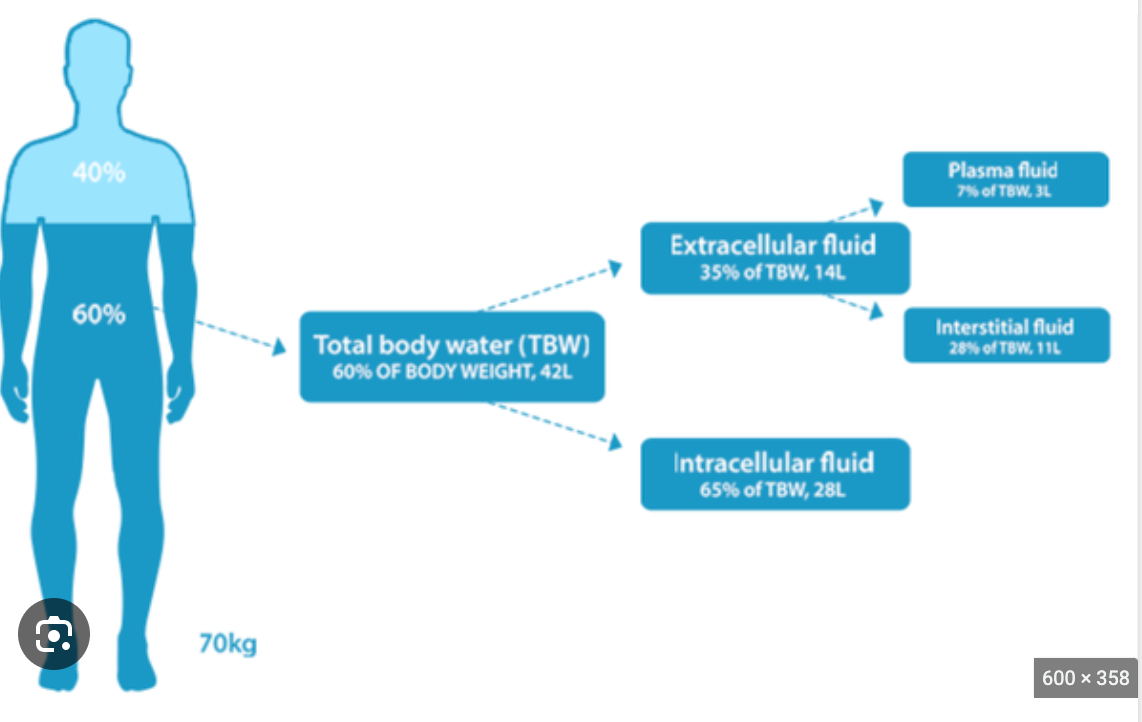 Water distribution: how much water is there in the (ECF)in 70kg man: