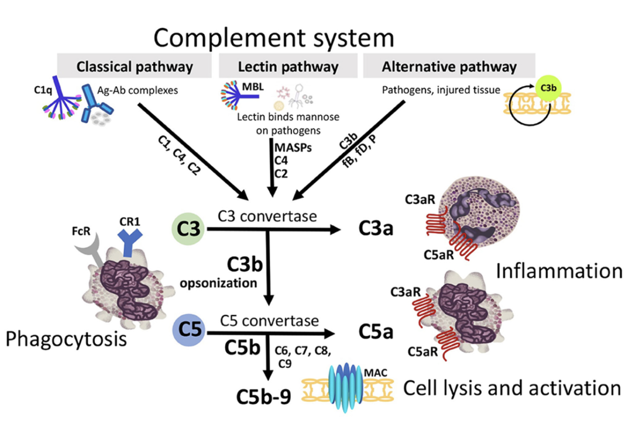 - C5a: anaphylatoxin, neutrophil chemotaxis and activation, increased vascular permeability, T cell development