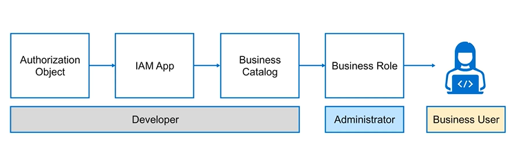 Explain the relation between authorization object, IAM App, Business Catalog and Business Role.